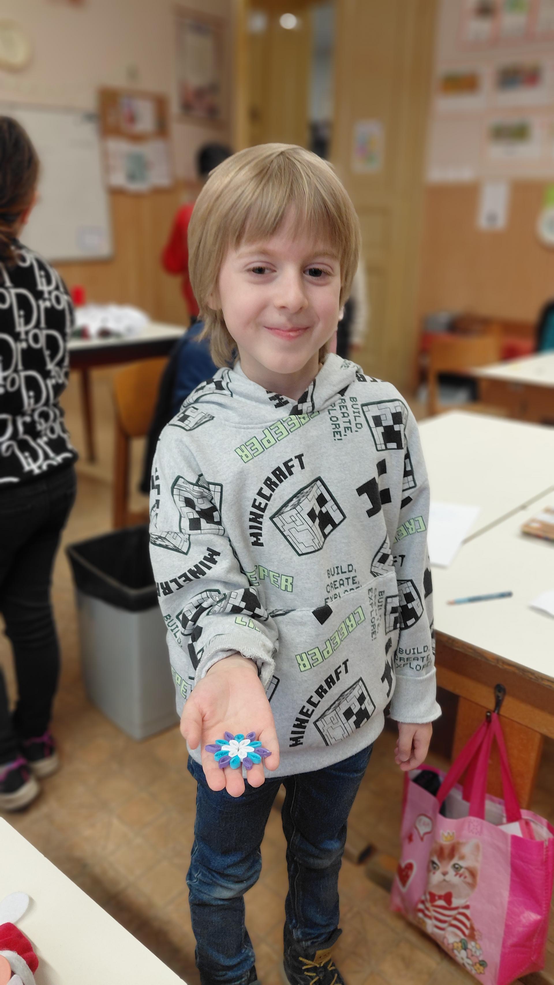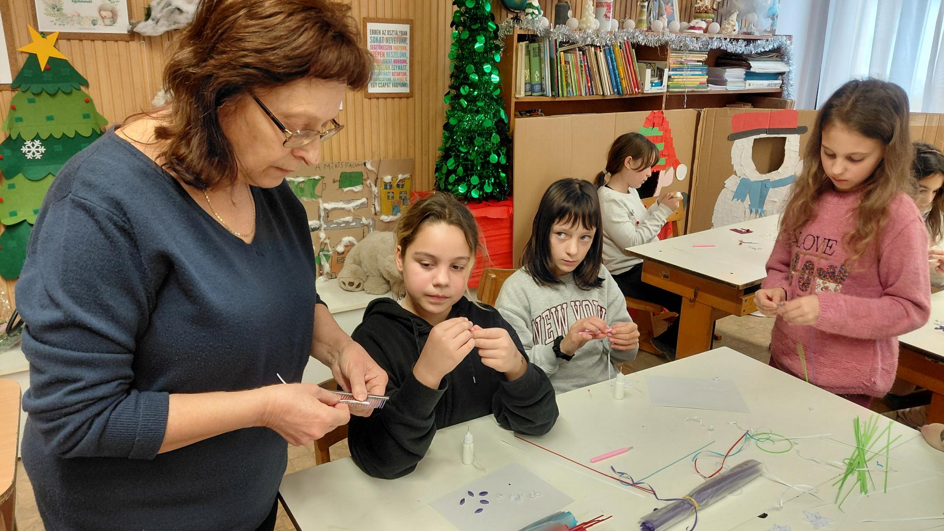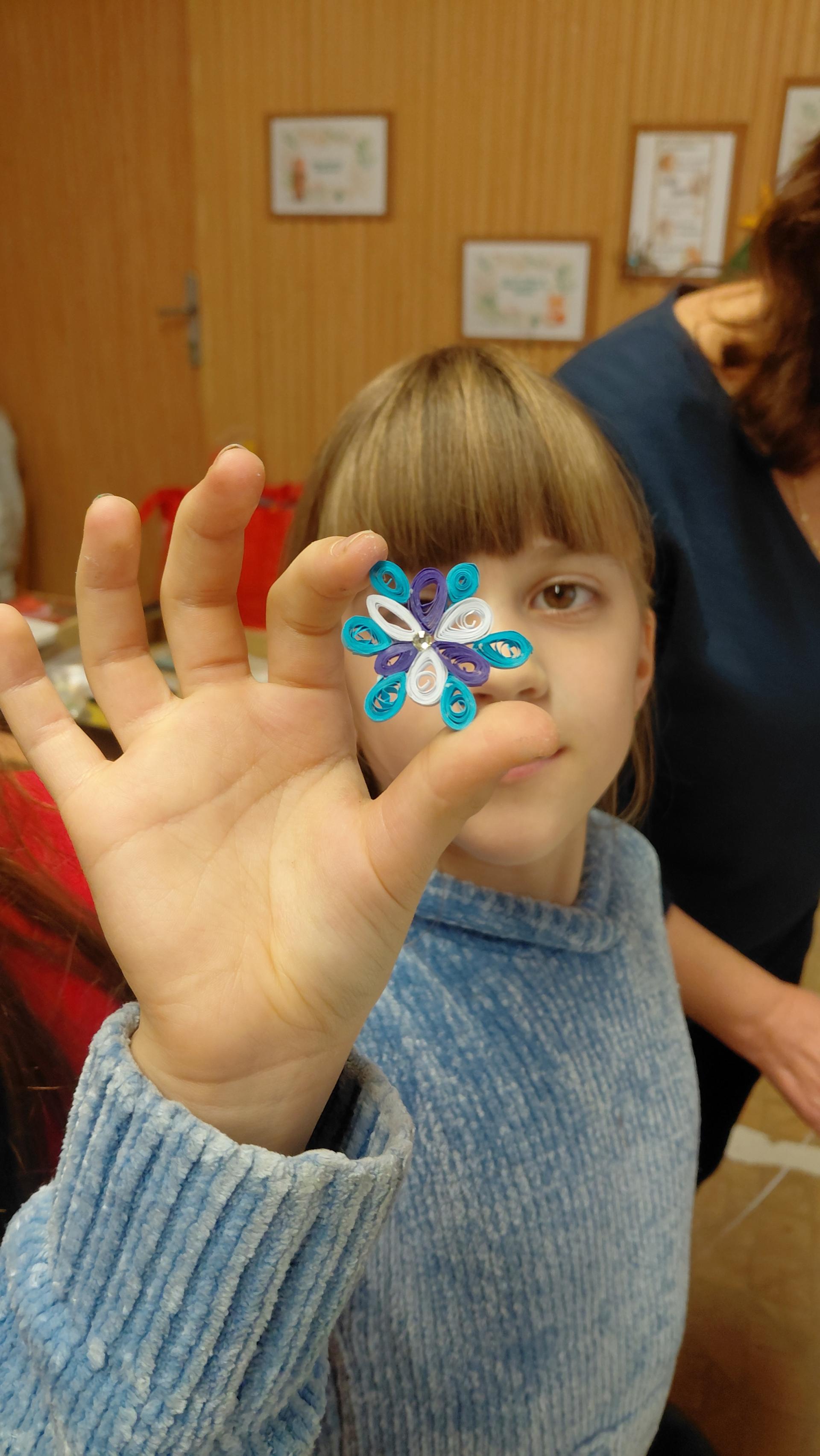A kézműves foglalkozások fénypontja a quilling művész volt, akinek az alkotásait megcsodálhatták a gyerekek, majd segítséggel el is készíthettek apró virágokat, hópelyheket.